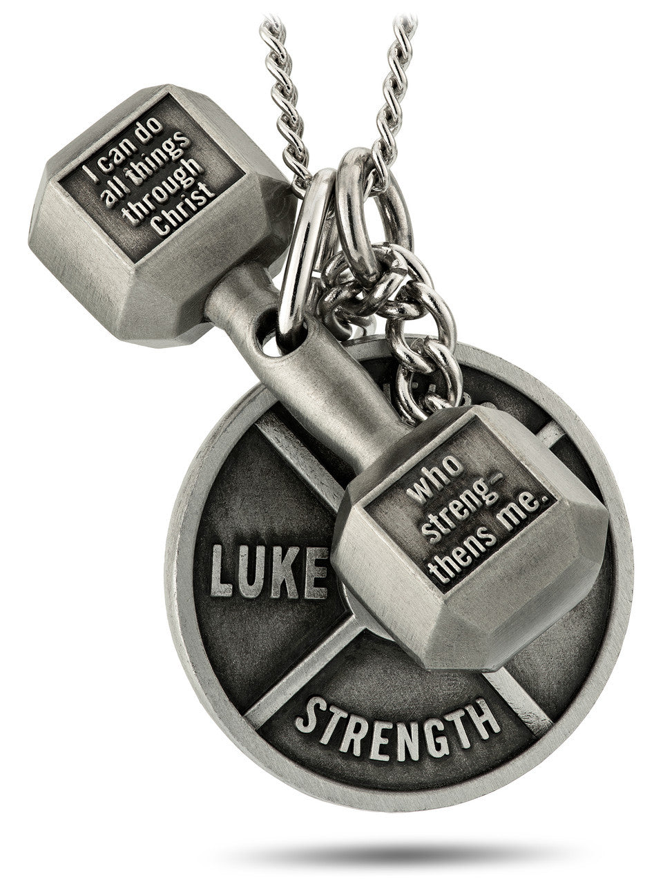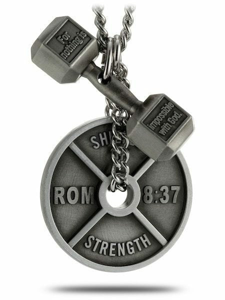 Men's Weight Plate & Dumbbell Pendant Combo Necklace with Romans 8:37 & Luke 1:37